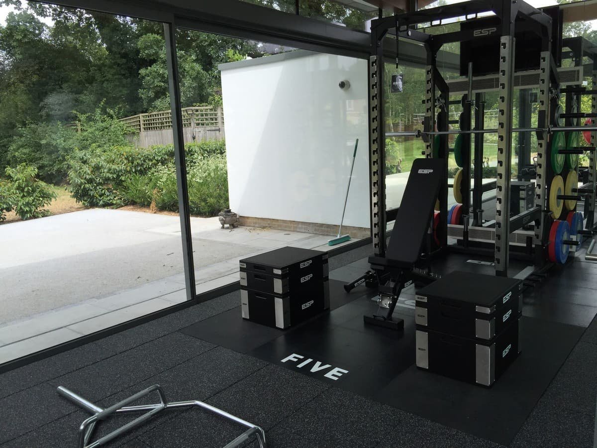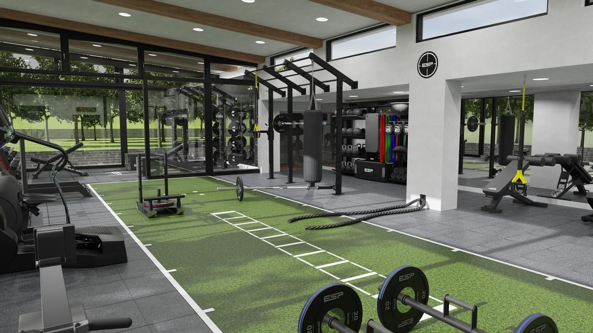 This 200sqm private home gym was created by transforming a former swimming pool into a state-of-the-art training space, combining functionality with bespoke design. The gym opens onto beautifully manicured gardens, with lots of natural light coming in from the large glass windows on two sides, creating an inspiring setting for performance. In the centre is a spacious open turf area, surrounded by a power rack, a functional training frame, strength and cardio machines. The custom-branded weightlifting platform, ensuring both individuality and elite performance. This is a large-scale home gym that for professional-level training in a unique and luxurious environment.