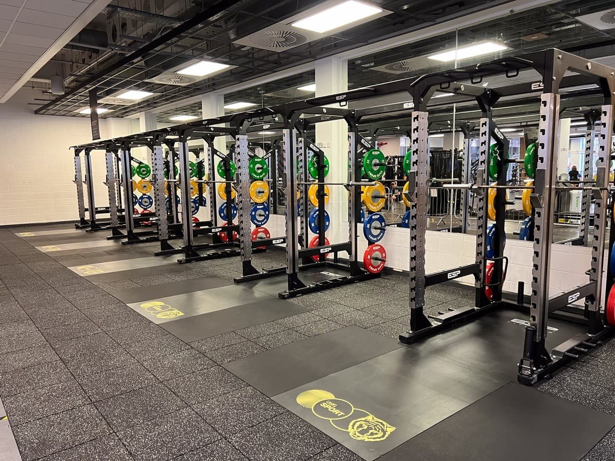 The University of Glasgow’s Powerplay Performance Gym is one of Europe’s largest and most advanced performance training facilities, designed to set a new benchmark in University sport. The gym features 24 Power Racks with integrated connecting bars and custom-branded weights, a bespoke ceiling-mounted functional training frame, and high-performance acoustic flooring with flush fitted Weight Lifting Platforms and a dedicated sled track. Every element was created to support elite-level training at scale, combining durability, functionality, and a bold visual identity that reflects the University’s ambition to be at the forefront of performance sport.
